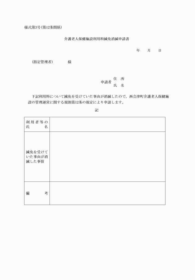3 利用料の減免を受けた者は,その事由が消滅したときは,ただちに,介護老人保健施設利用料減免事由消滅申請書(様式第3号)を指定管理者に提出しなければならない。